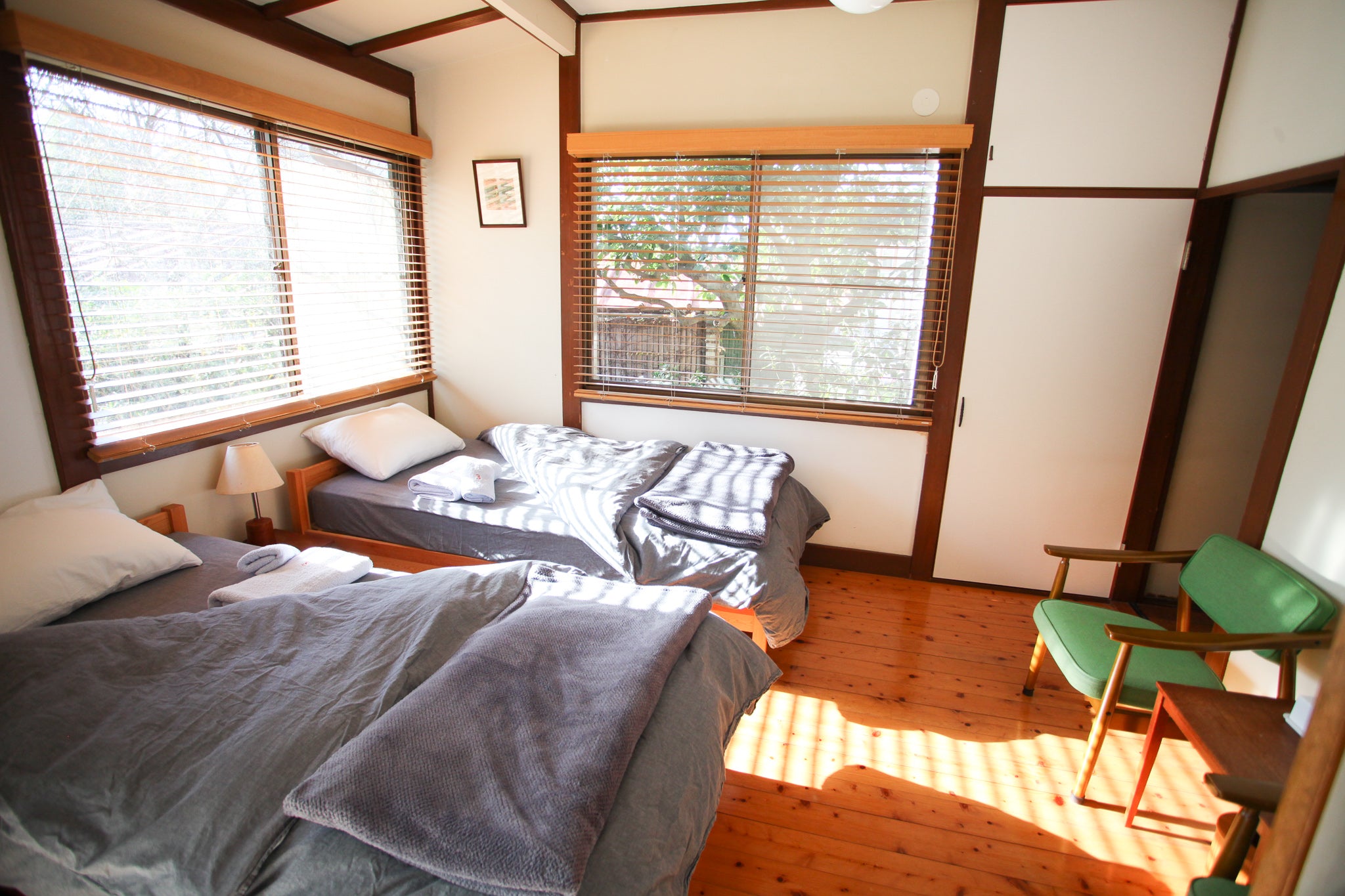 寝室はシングルベッド3台と敷き布団を2セットご用意しており、最大5名様まで一泊3万円〜お泊りいただけます。