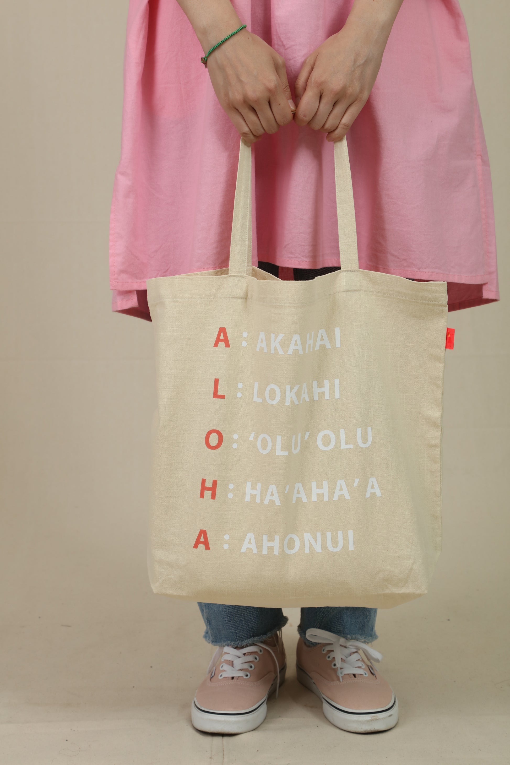 SUNSHINE+CLOUDオリジナルのALOHAトートバッグ。肩掛け可能で、マチもあります。