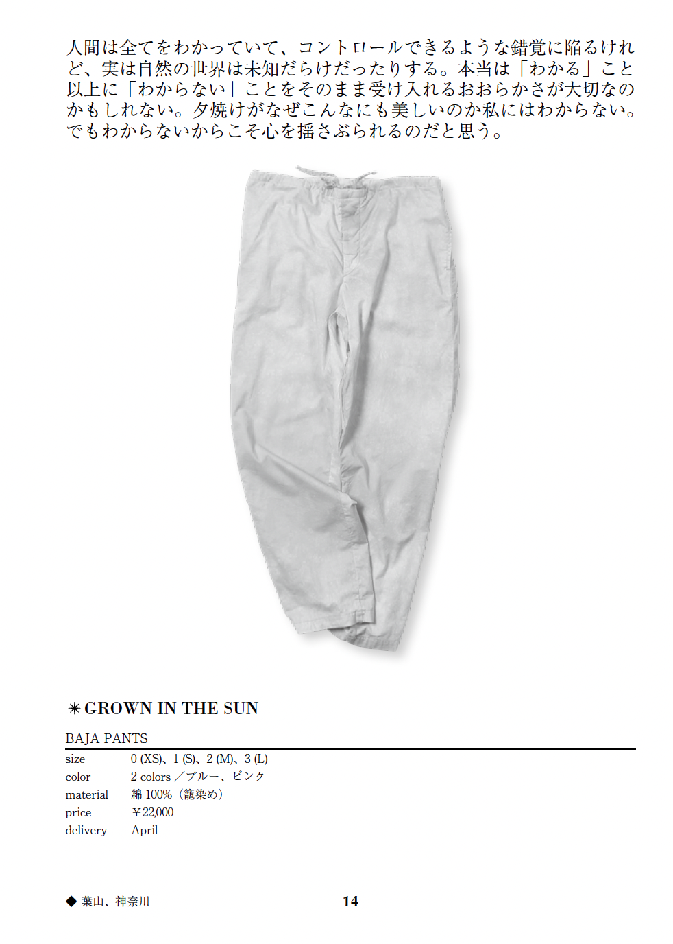 SUNSHINE+CLOUD定番のBAJA PANTS. 今年は「籠染め」の技法をアレンジした生地を使用しています。ものにより、濃淡に差があります。ご了承ください。
