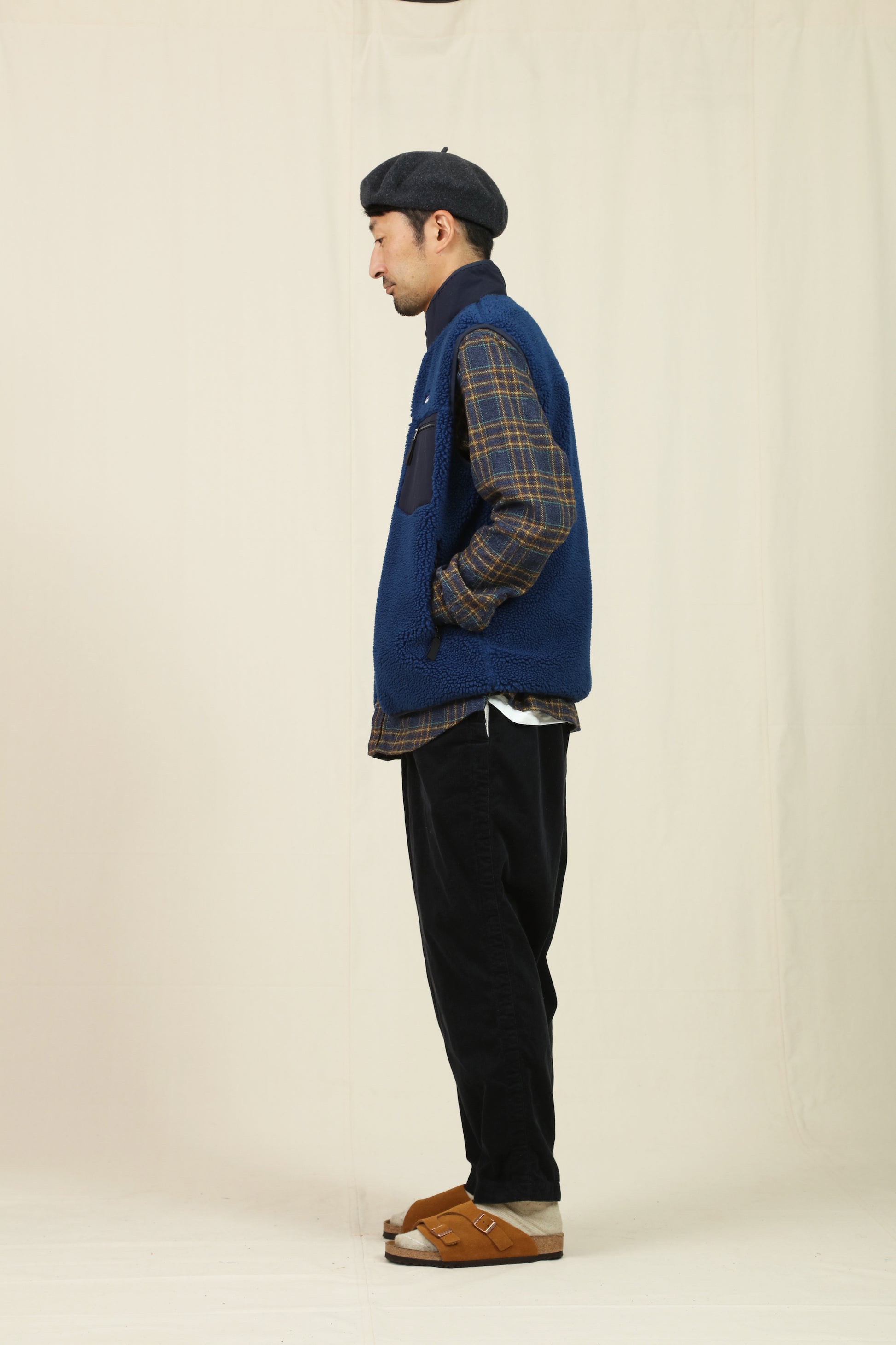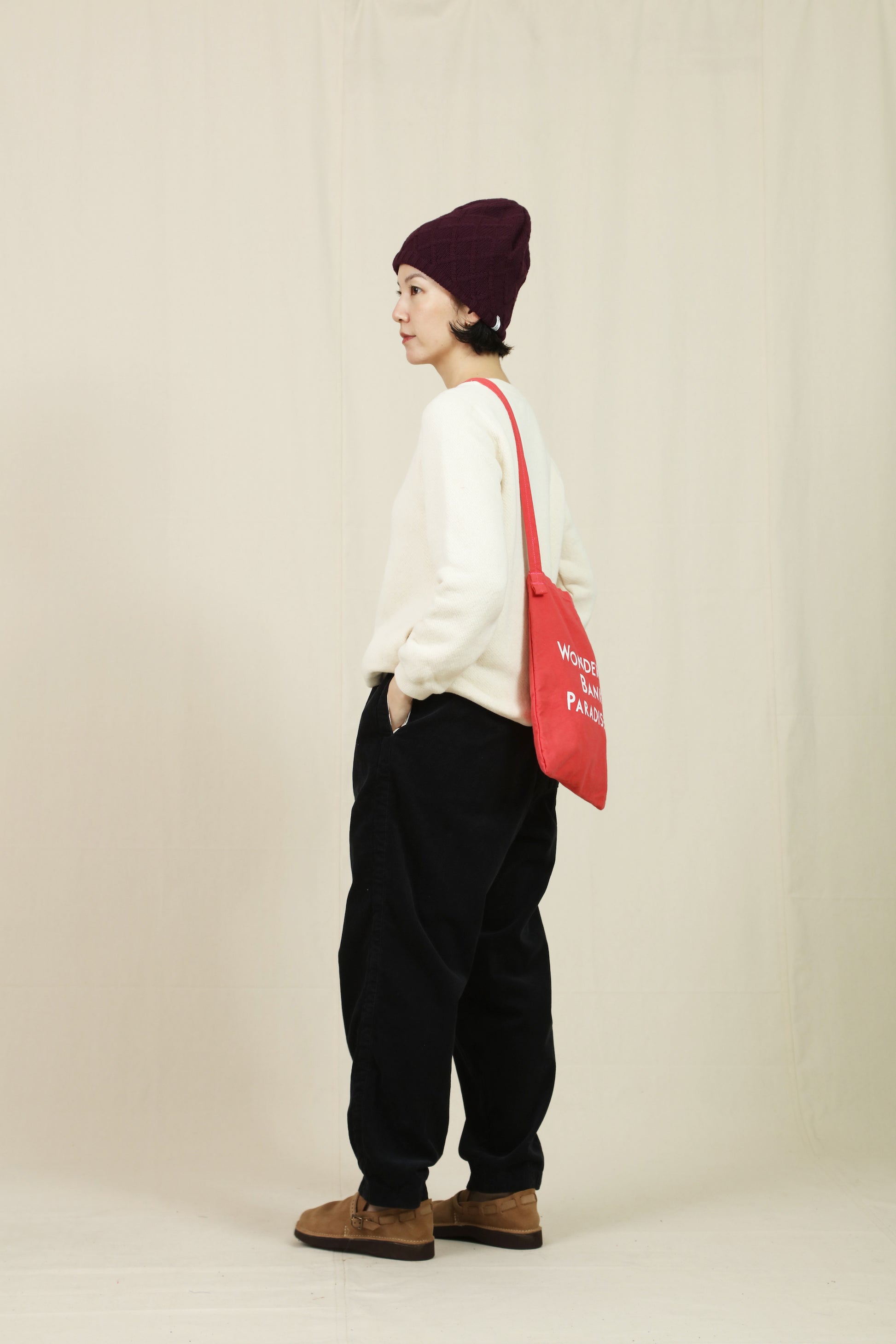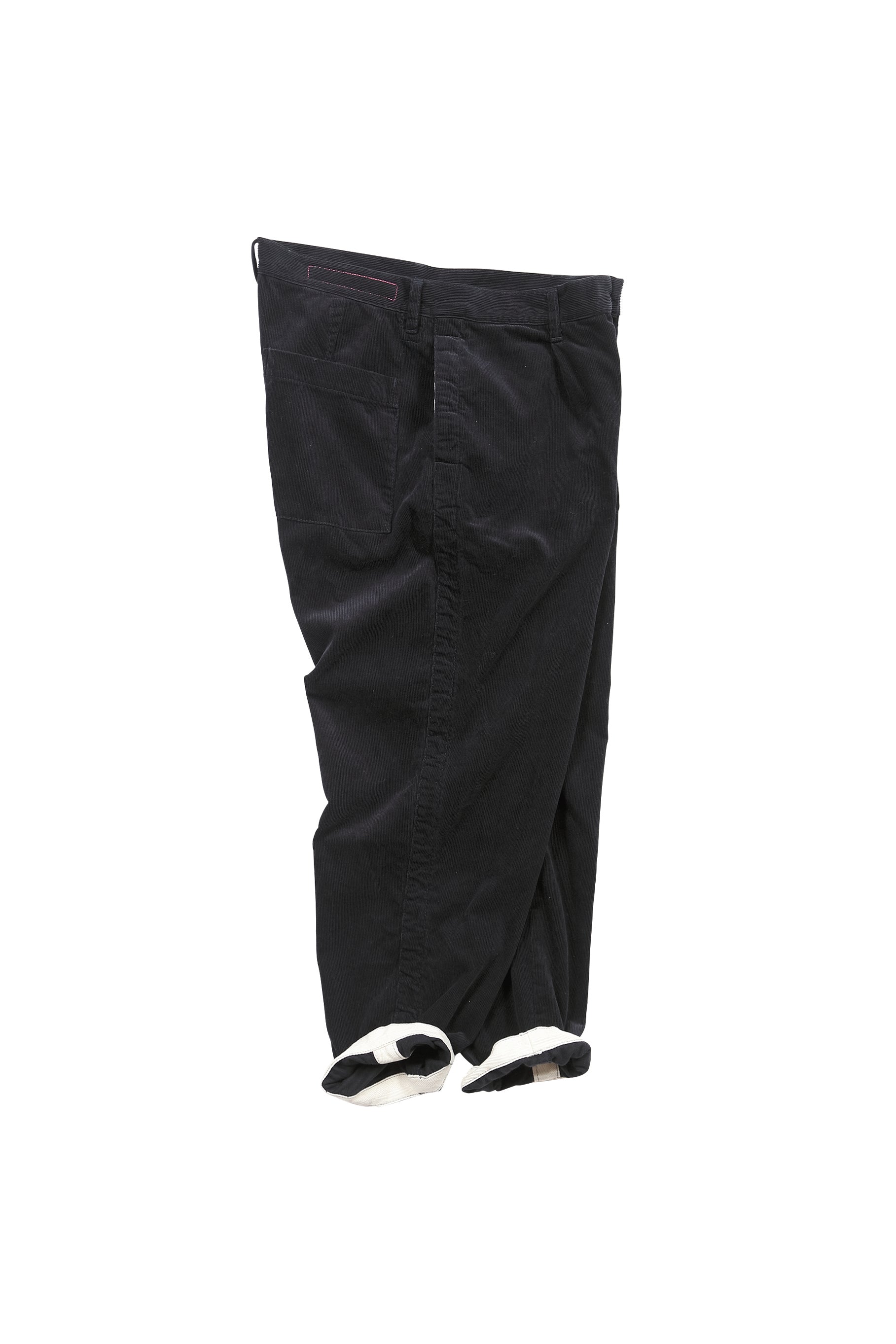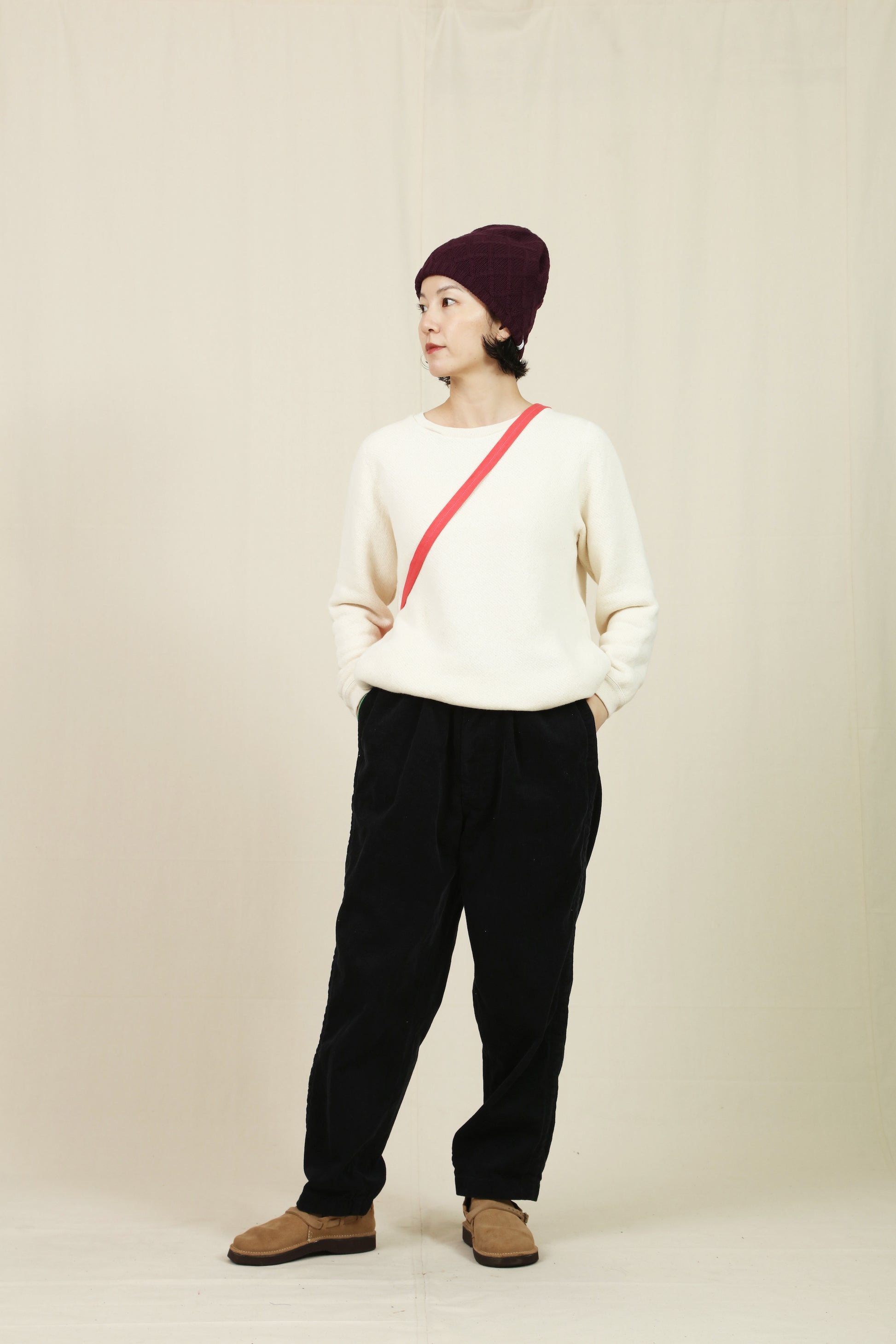 腰回りはゆったり、裾にかけてテーパードしたシルエット。やや太めの畝のコーデュロイで、裾の内側に白い綾テープがデザインされています。裾をロールアップしてはいても。