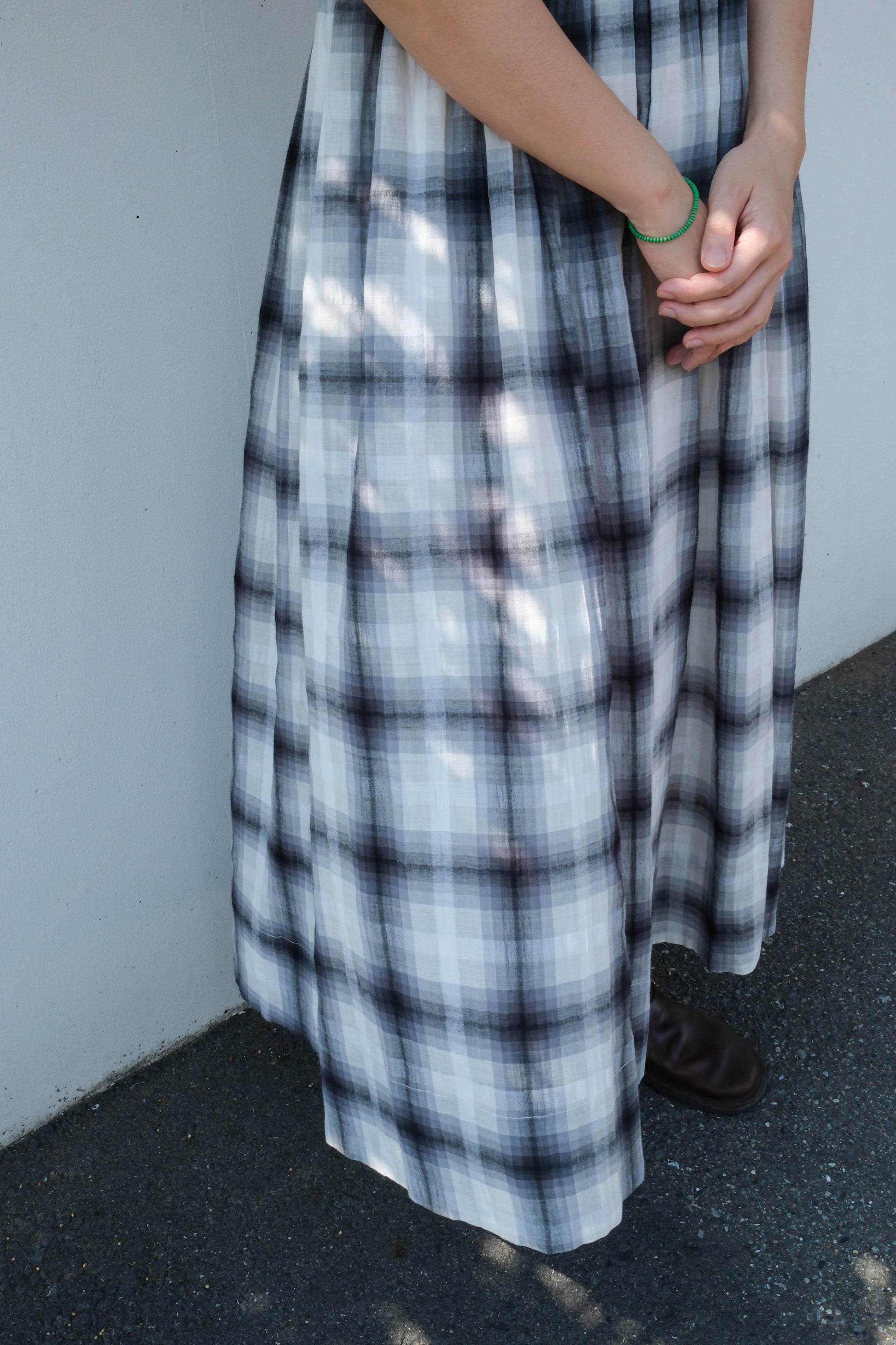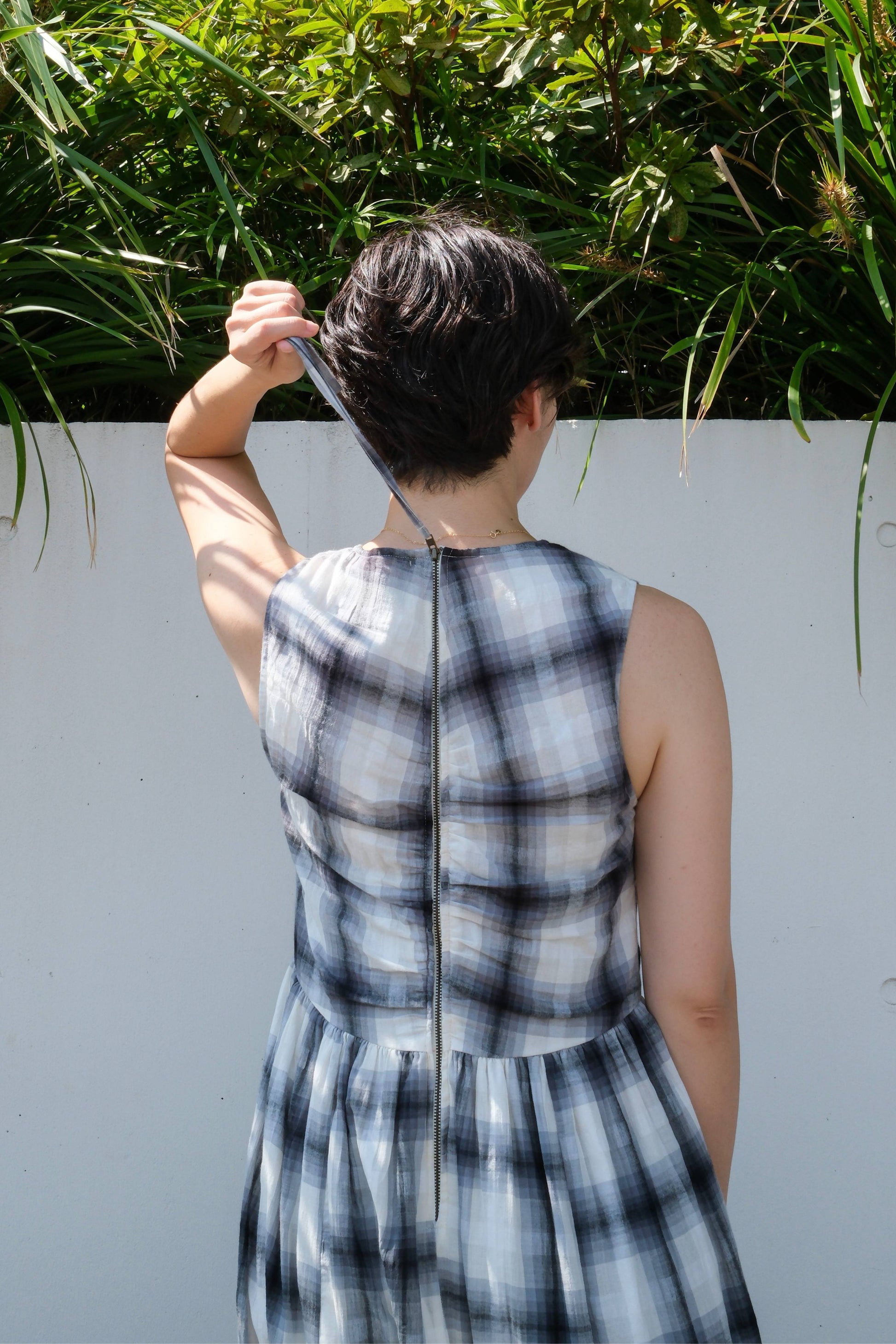 白と黒のコットン糸で手編みされた柔らかいドレス。背中のファスナーは共布が長めに付いており、脱ぎ着しやすいです。白いコットンの裏地付き。