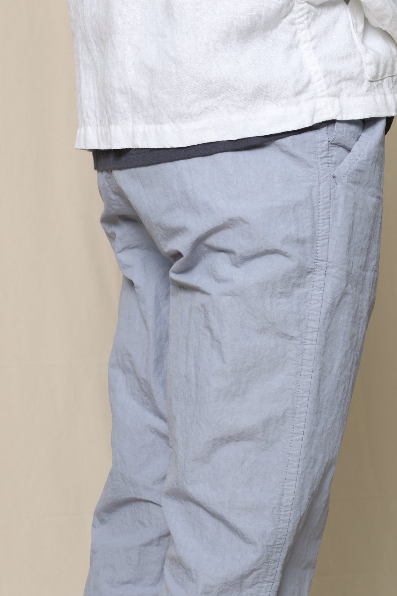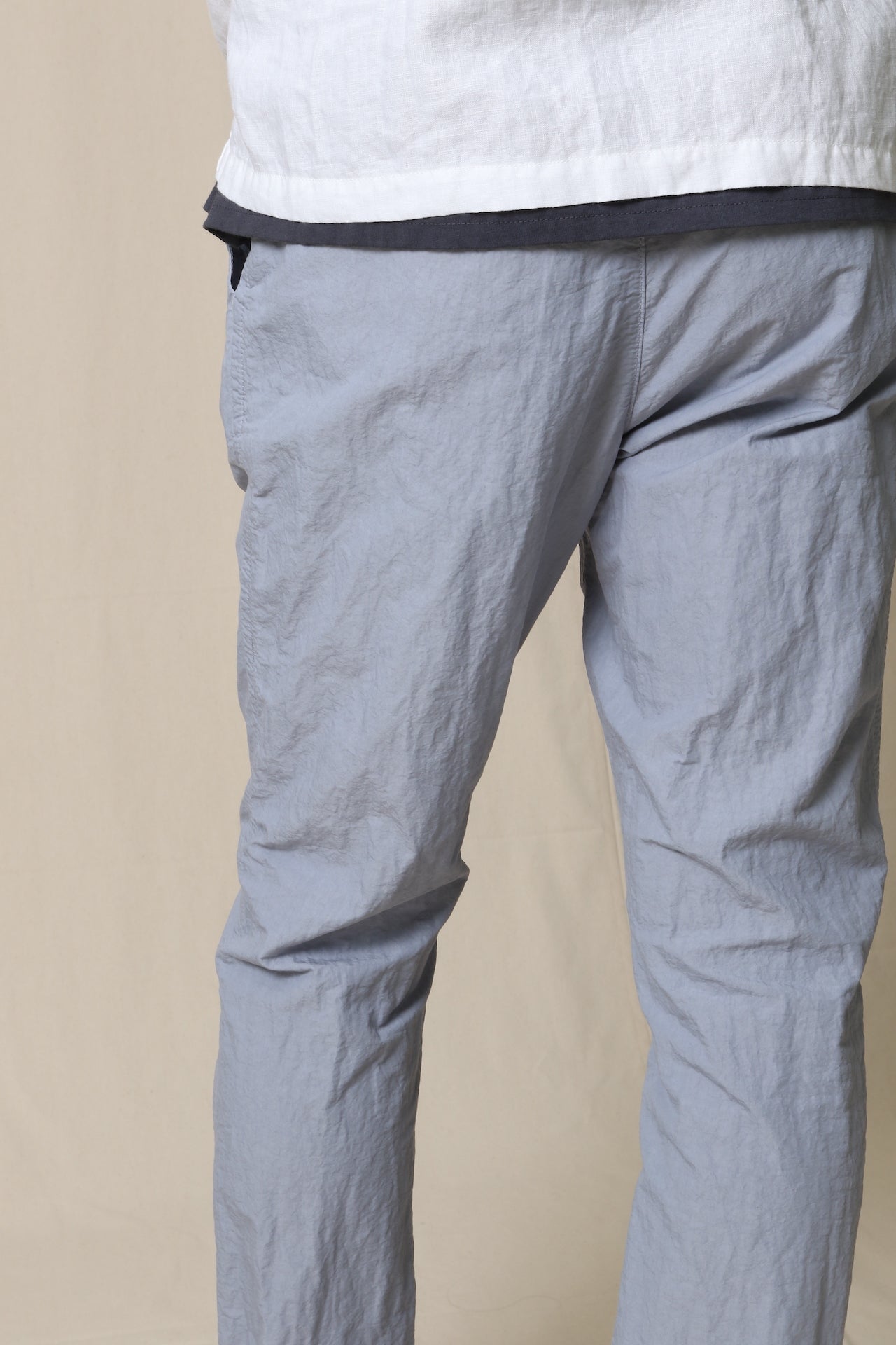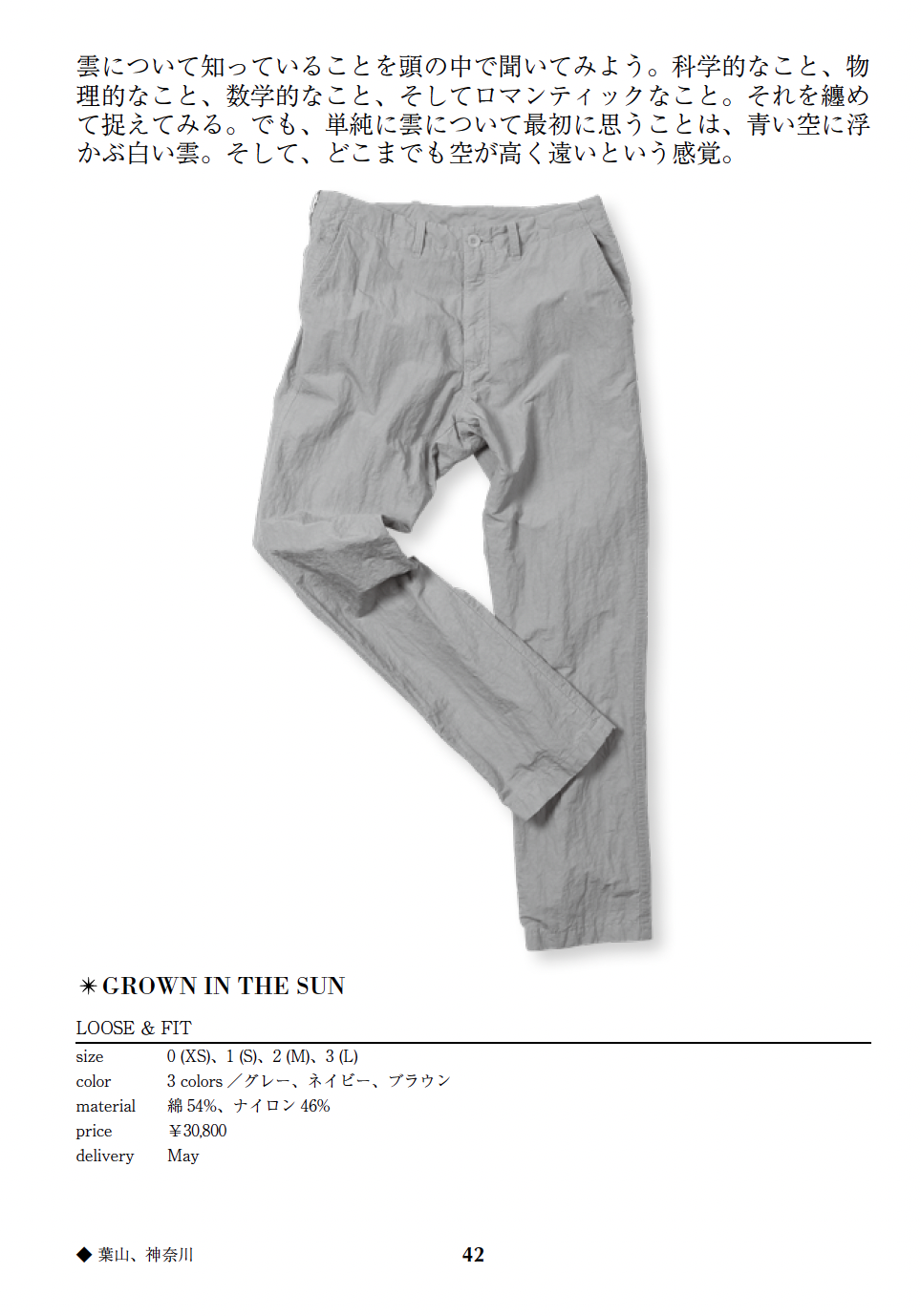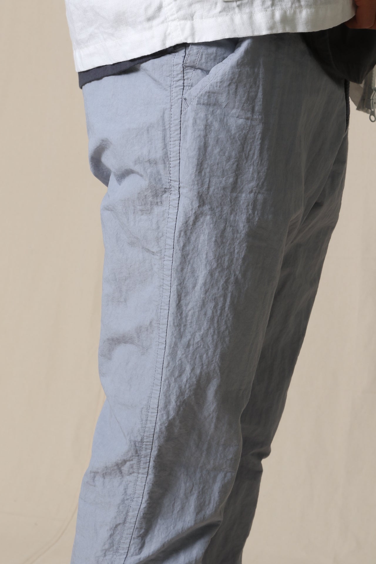 コットンナイロンのタイプライターに、丹念な揉み込み加工を施したシボ感が特徴的な生地です。製品染め、定番のLOOSE&FIT。