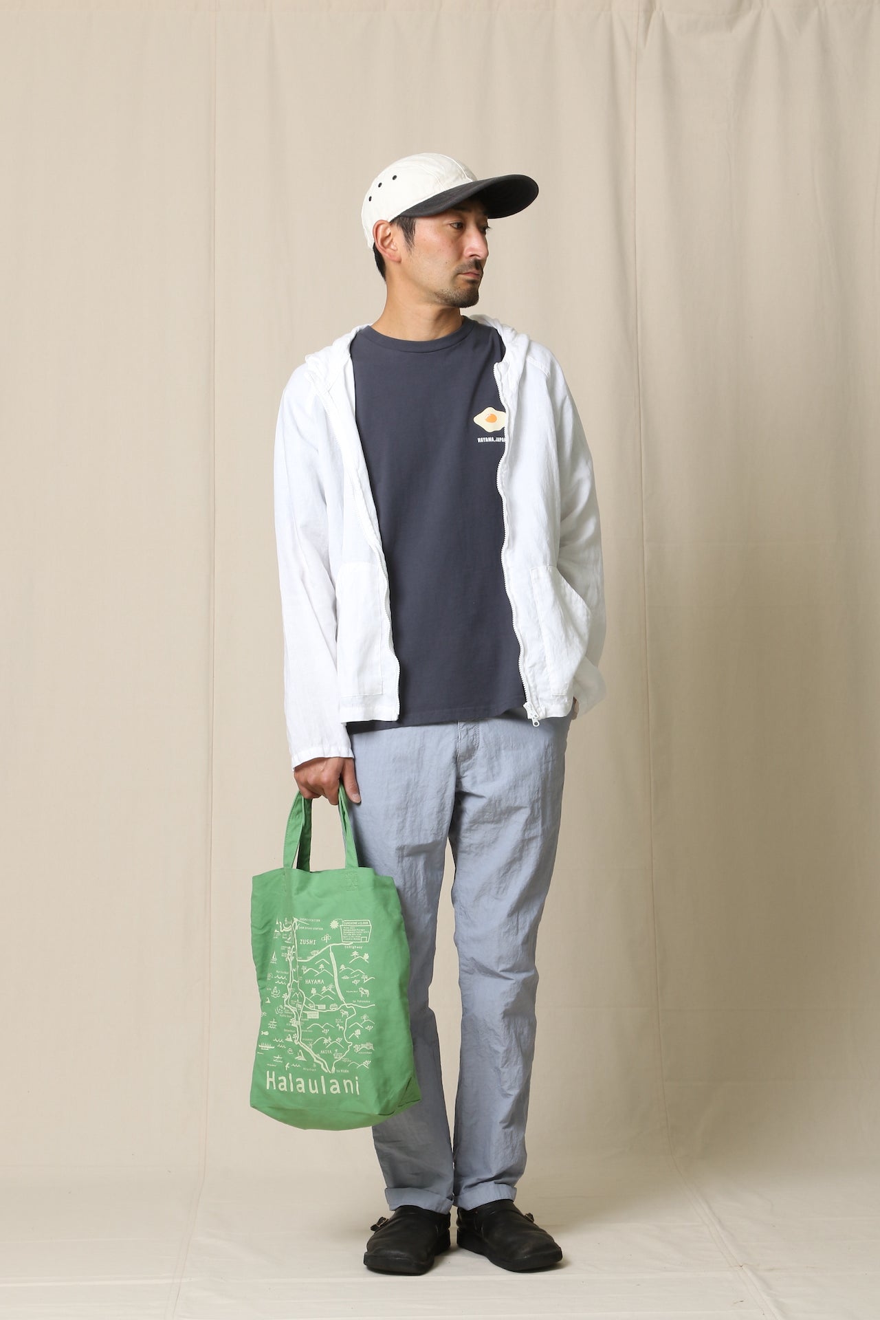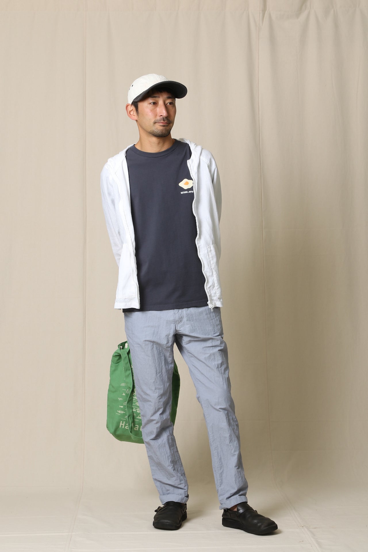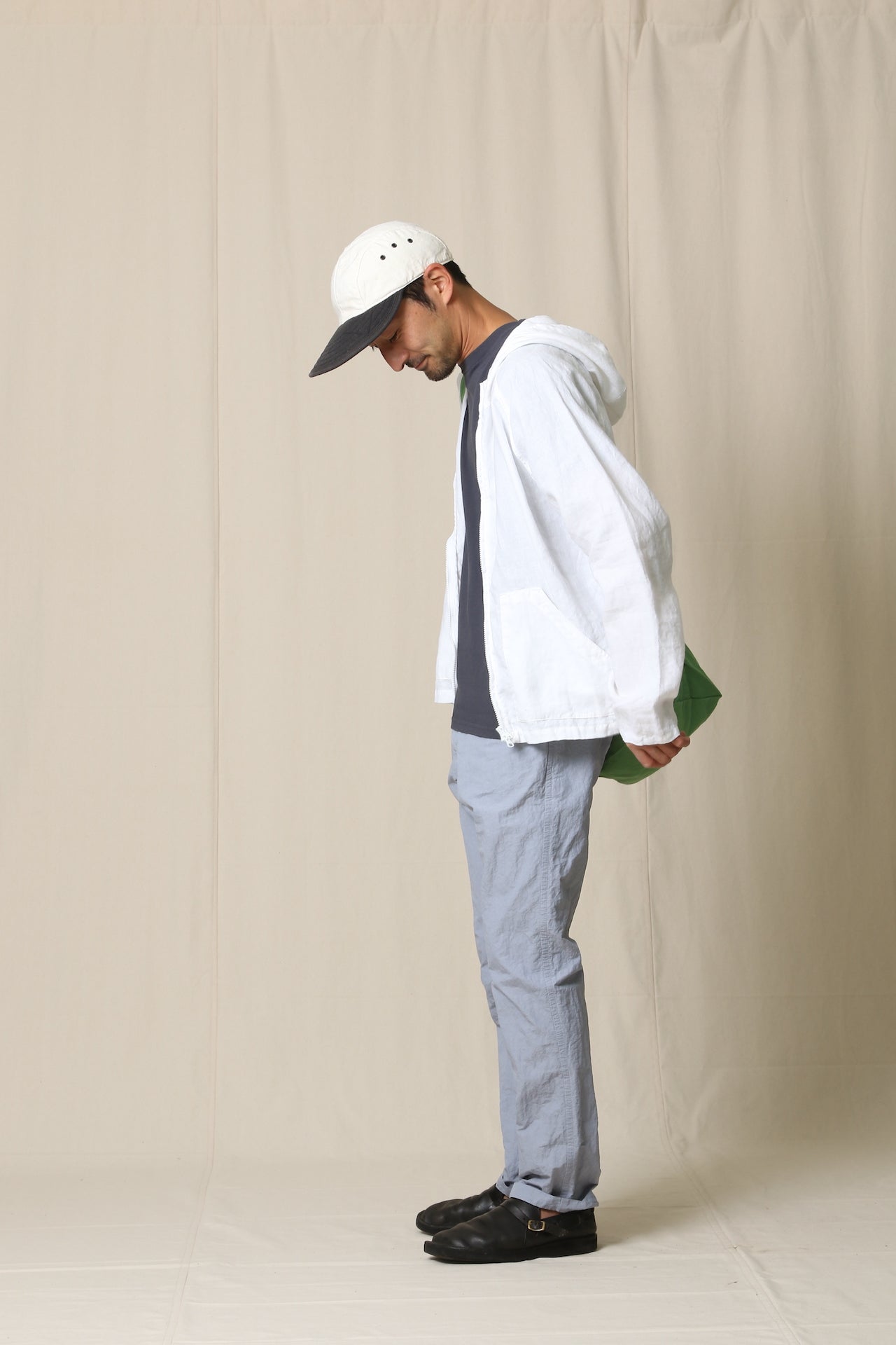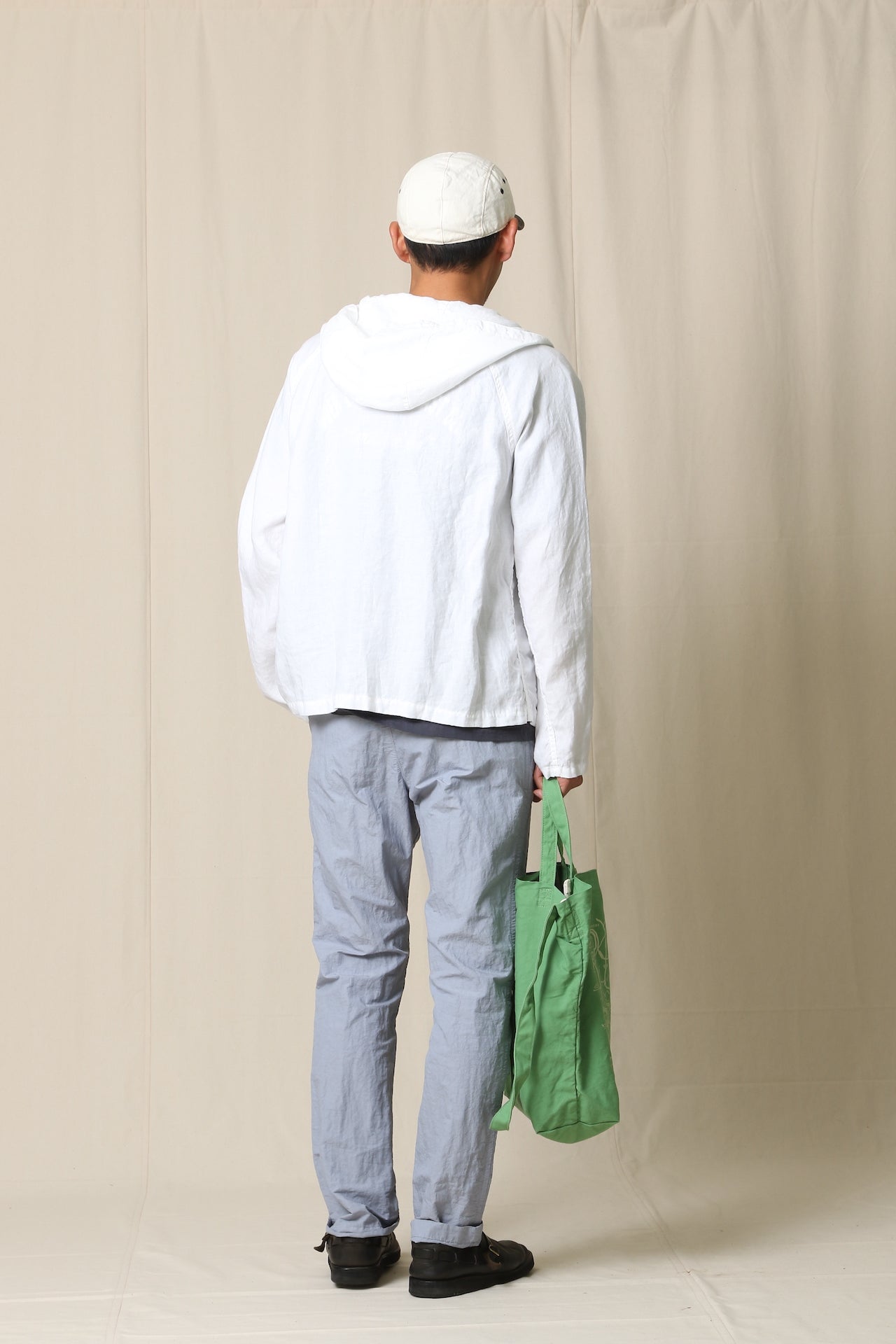 コットンナイロンのタイプライターに、丹念な揉み込み加工を施したシボ感が特徴的な生地です。製品染め、定番のLOOSE&FIT。